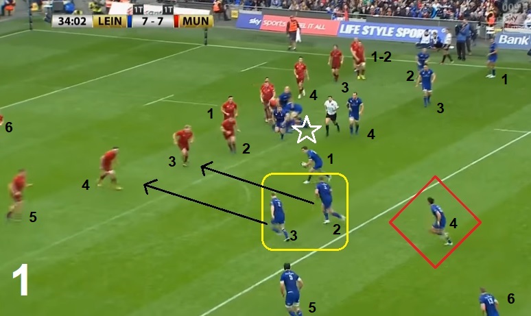 – Leinster attacca con tre linee di attacco e due giocatori pesanti (quadrato giallo) tra la prima e la seconda