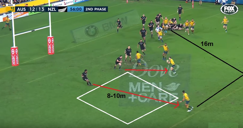Il punto d’incontro è a ridosso dei 5, ma Folau riceve palla appena dentro i 22. Tanti metri persi, ma possibilità di mettere 8-10 metri tra l’estremo e Naholo. Le linee di corsa di Folau e i cambi di direzione risultano fondamentali per vincere il 2 vs 2