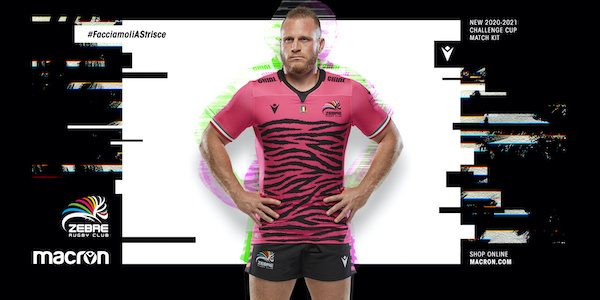 Pur mantenendo lo stile, per l’appunto, zebrato che contraddistingue l’identità della squadra, la divisa che la squadra indosserà nelle partite della competizione cadetta in Europa sarà rosa fluo, scelta dettata da uno dei colori che compongono lo stemma del club e ispirata all’innovativa scelta dello Stade Français di Max Guazzini di portare sul palcoscenico del rugby, oramai una quindicina d’anni fa, un colore praticamente mai utilizzato prima.
