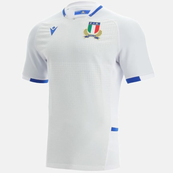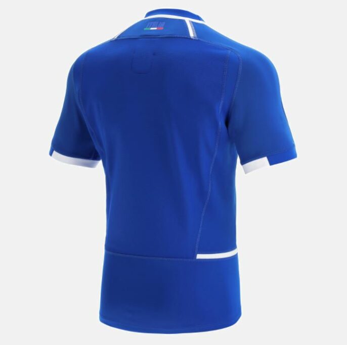 Il collo è a V con bordi in azzurro Italia, così come azzurri sono i dettagli sulle maniche e degli inserti sui fianchi. Il backneck è personalizzato e ne retrocollo esterno, tono su tono, appare la scritta ITALIA e la bandiera tricolore. Sul petto in azzurro il Macron Hero e a sinistro lo stemma della F.I.R.