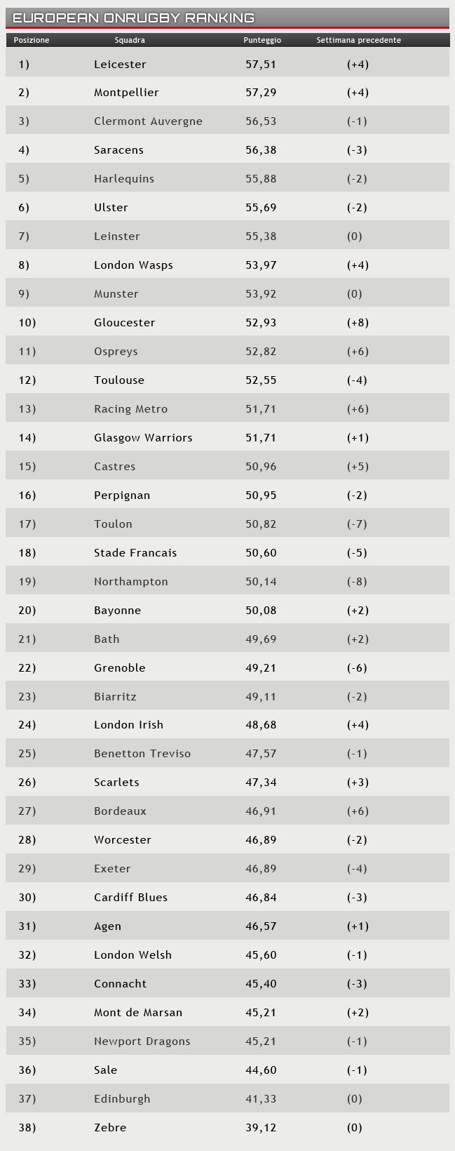 Vediamo: Tigers e Montpellir si catapultano alle prime due posizioni salendo entrambi di quattro scalini. Scivolano indietro Clermont (-1), Saracens (-3), Harlequins e Ulster (entrambi -2). Nella top 10 fanno il loro prepotente ingresso anhe i London Wasps, oggi ottavi. La palma di migliore della settimana va però al Gloucester che con un +8 arriva alla posizione numero 10.