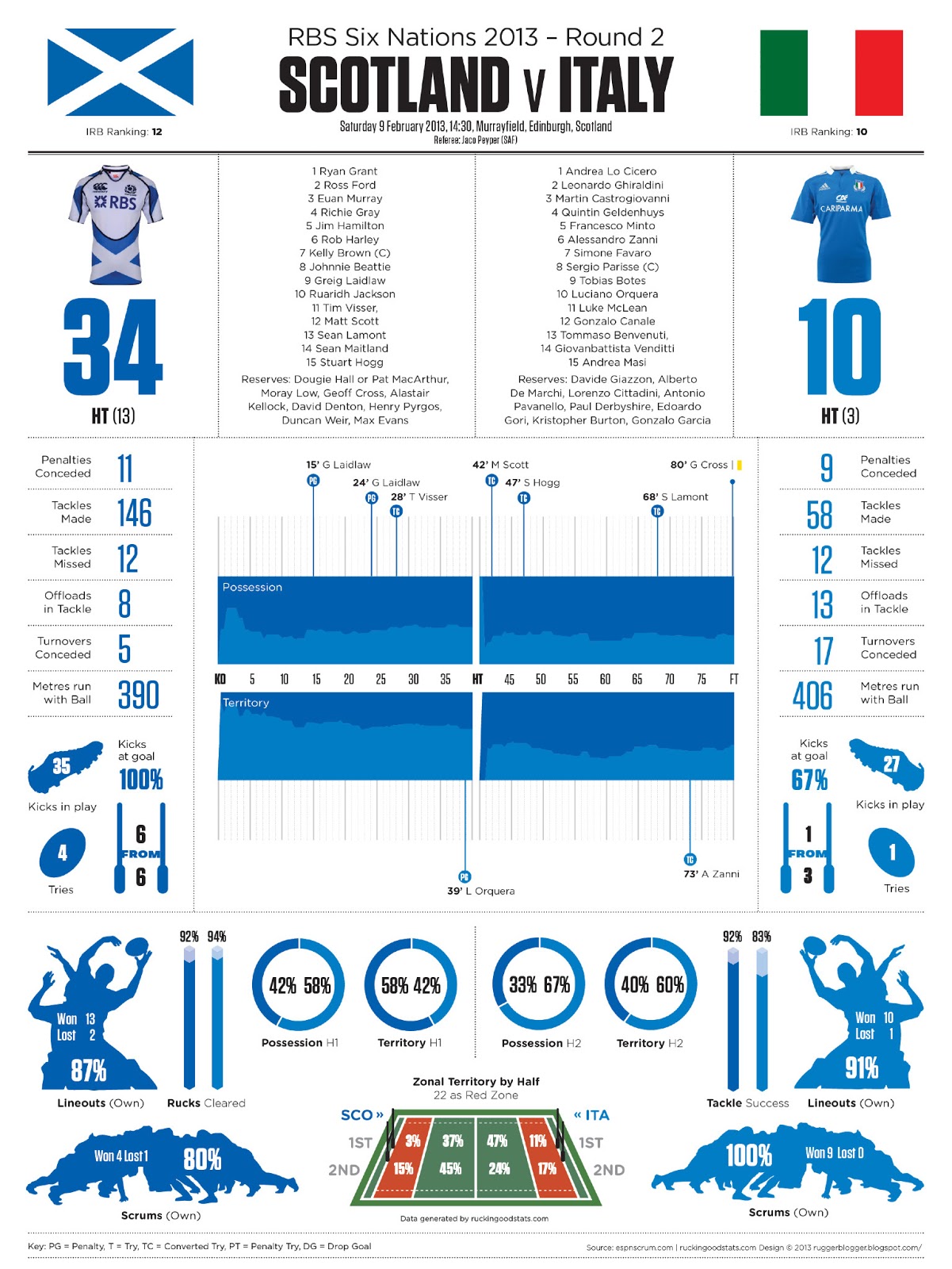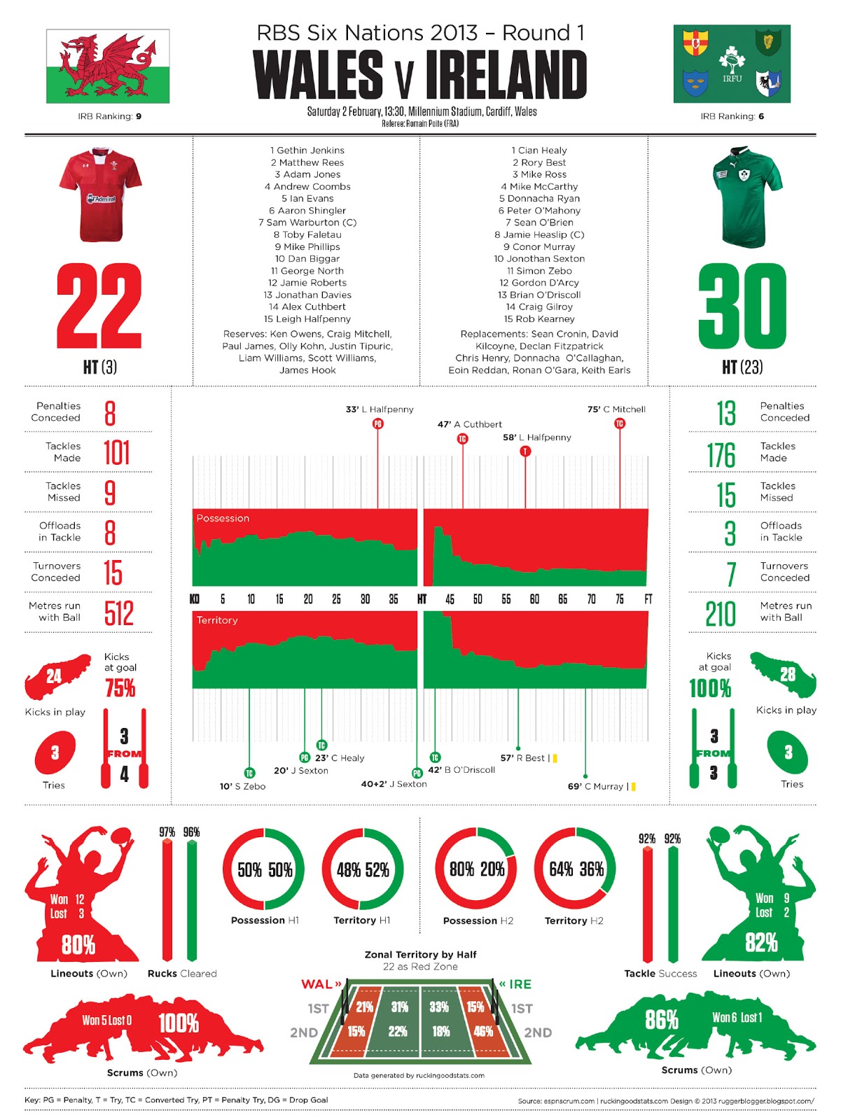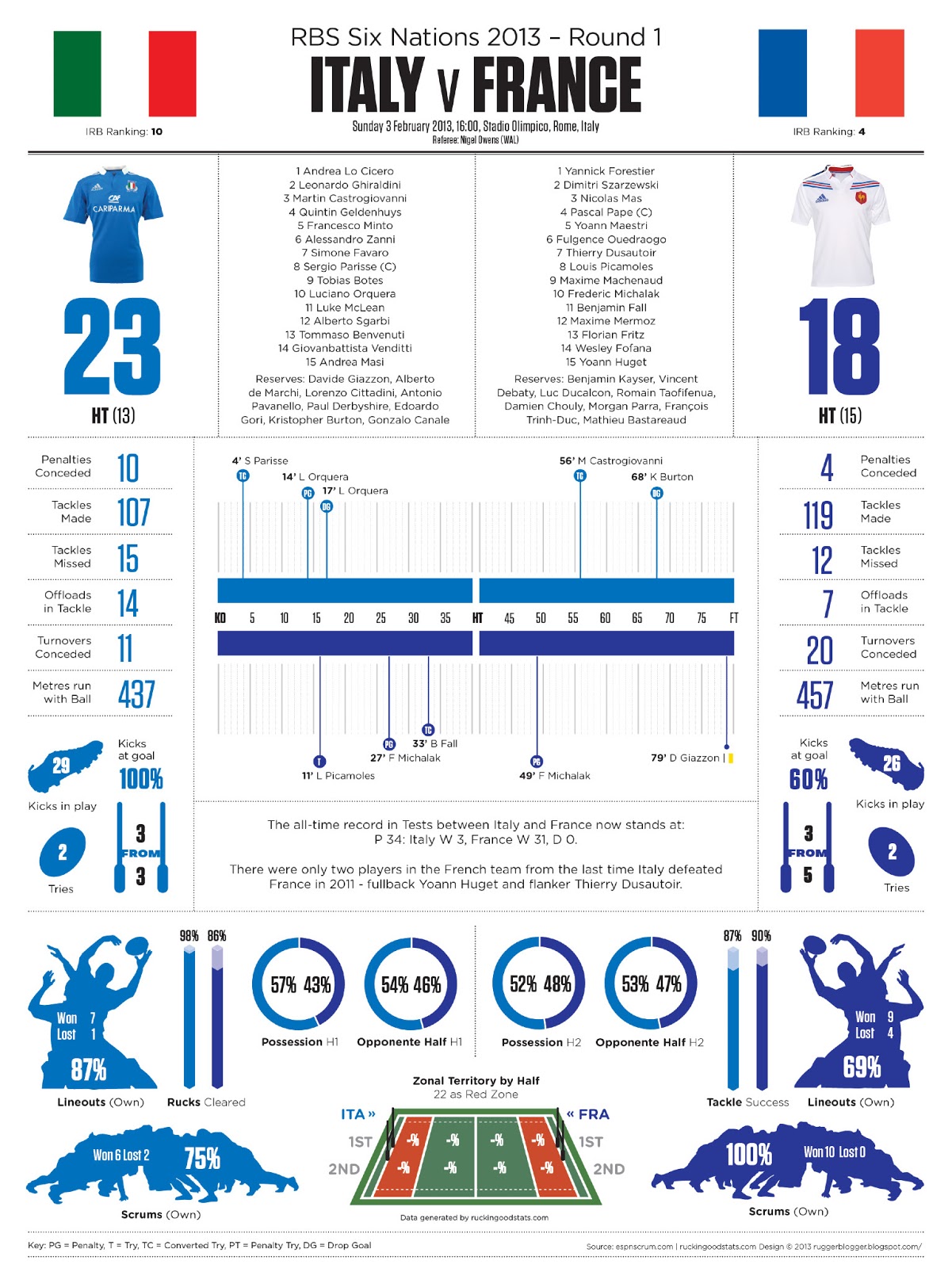 Dati, nomi e numeri. Le prime sei partite del Sei Nazioni 2013 in sei infografiche prodotte da Ruggerblogger. Cliccare sulle immagini per ingrandirle