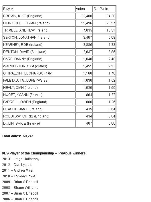Un torneo sontuoso, un premio meritato. Probabilmente il cuore e la pancia dei tifosi stavano con Brian O’Driscoll ma la testa – giustamente – ha detto Mike Brown: l’estremo della nazionale inglese è stato votato dai tanti appassionati che lo hanno eletto come miglior giocatore del sei Nazioni 2014. Per lui oltre 23mila voti (il 34,3%) contro i 19mila abbondanti di BOD. poi Trimble, Sexton e Kearney. Leonardo Ghiraldini fa sua la nona posizione.
