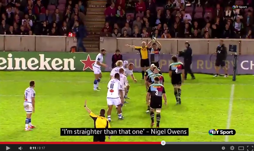 Ora veniamo al rugby: nel corso del primo turno di Champions Cup si è giocata la partita tra Harlequins e Castres, arbitro quel Nigel Owens non nuovo a uscite particolari e omosessuale dichiarato. Una touche a favore dei Quins esce decisamente storta dalle mani del tallonatore e il direttore di gara ferma tutto, giustamente. Aggiungendo “I’m straighter than that one”, ovvero “sono più dritto io”. Oppure “sono più etero di quanto non sia dritto questo lancio”. Autoironia e sarcasmo: chapeau.