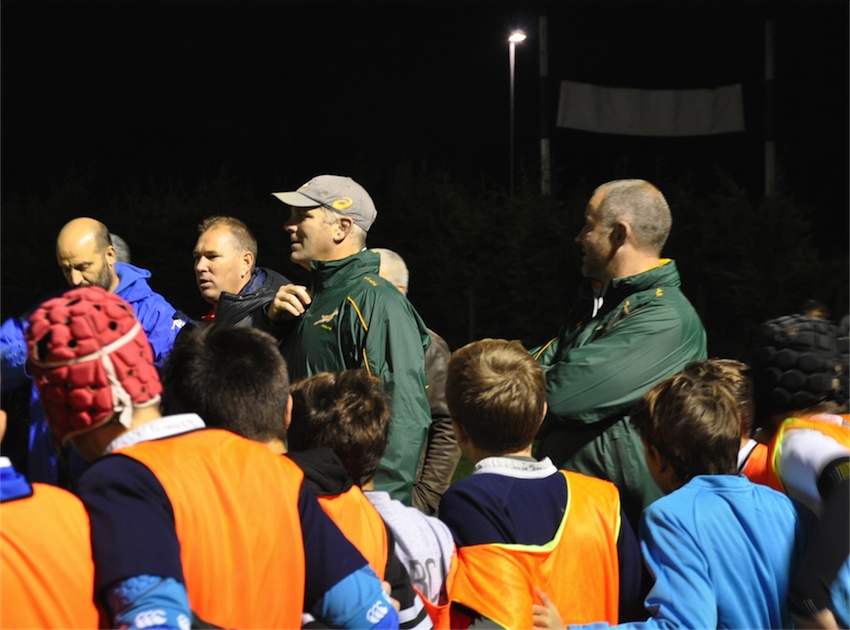 Mercoledì 19 novembre alcuni componenti dello staff tecnico sudafricano hanno voluto visitare il club di Polla e in serata hanno raggiunto gli impianti del Valsugana per trascorrere un po’ di tempo con i ragazzini del settore minirugby. Ne ha approfittato il Centro di Formazione Under 16, che raccoglie i migliori atleti di tutte le società di Padova e dintorni, affidati in via del tutto eccezionale alle cure di Pieter de Villiers e Louis Koen. I due tecnici degli Springboks hanno così lavorato con gli juniores padovani rispettivamente sulla tecnica di mischia ordinata e su quella dei calci piazzati. Niente male come esperienza