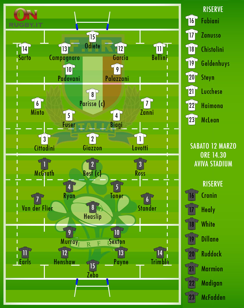 Lo staff tecnico azzurro ha annunciato la formazione che sabato scenderà in campo all’Aviva Stadium contro l’Irlanda nella quarta giornata del Sei Nazioni 2016. In mediana va la coppia Padovani-Palazzani, con Gori che non sarà del match per infortunio e Lucchese in panchina. Ad estremo confermato Odiete, mentre dal primo minuto c’è anche Biagi in seconda linea. Tra le terze linee non c’è Van Schalkwyk, che fa rientro al club per infortunio così come Ghiraldini.