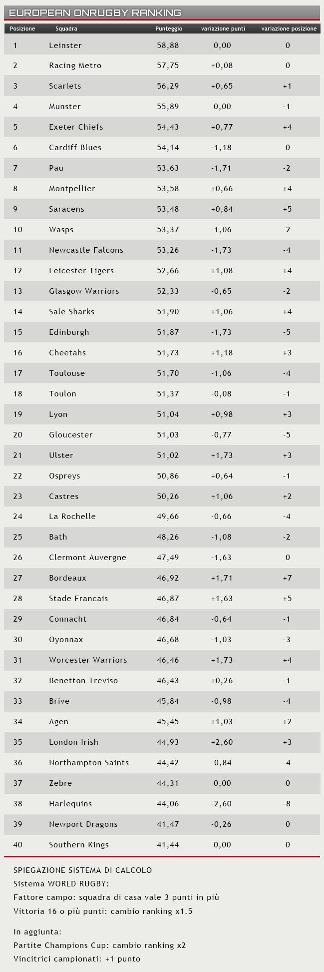 Da registrare poi vi sono i notevoli balzi in avanti di Montpellier, attualmente prima in Top 14, e Saracens: entrambe infatti arrivano in Top 10. Sul fronte italiano, infine, scivola al 32esimo posto il Benetton Treviso con le Zebre che rimangono invece 37esime.