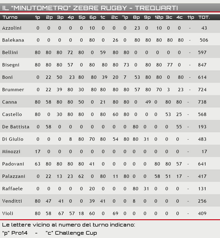 Giulio Bisegni guida la speciale graduatoria dei trequarti zebrati, con quasi 900′ in stagione. Grande spazio anche per Edoardo Padovani, che ha ritrovato ritmo gara e condizione dei tempi migliori, oltre che per la coppia di aperture Canna-Brummer, entrambe sopra i 700′.