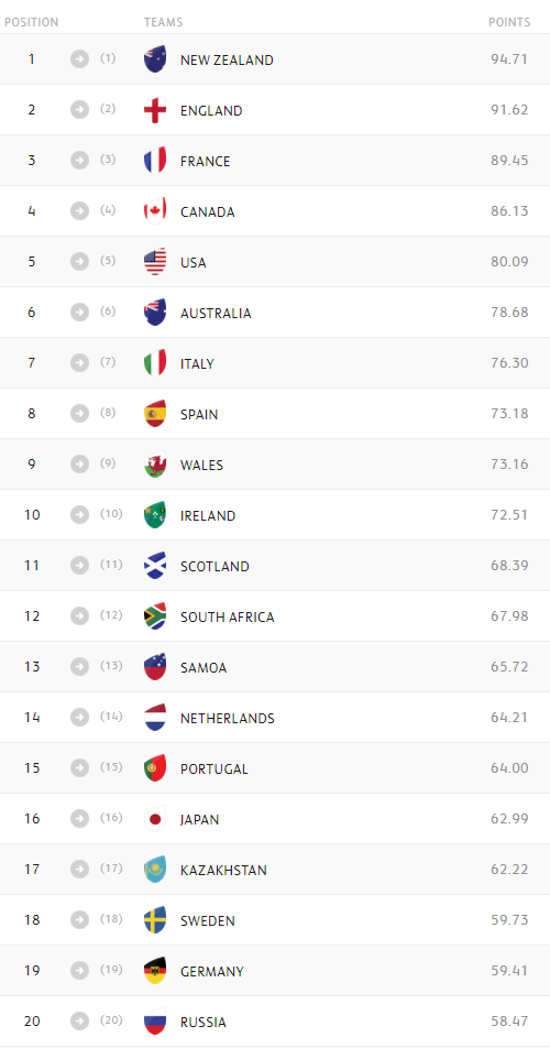 Anche nel ranking femminile l’Italia resta nella medesima posizione, cioè al settimo posto, ma grazie alla larga vittoria a Glasgow contro la Scozia guadagna poco più di un punto e resta la terza miglior europea al mondo davanti a Spagna, Galles, Irlanda e appunto Scozia. Inghilterra e Francia restano sui gradini più bassi del podio, dietro alle Black Ferns.
