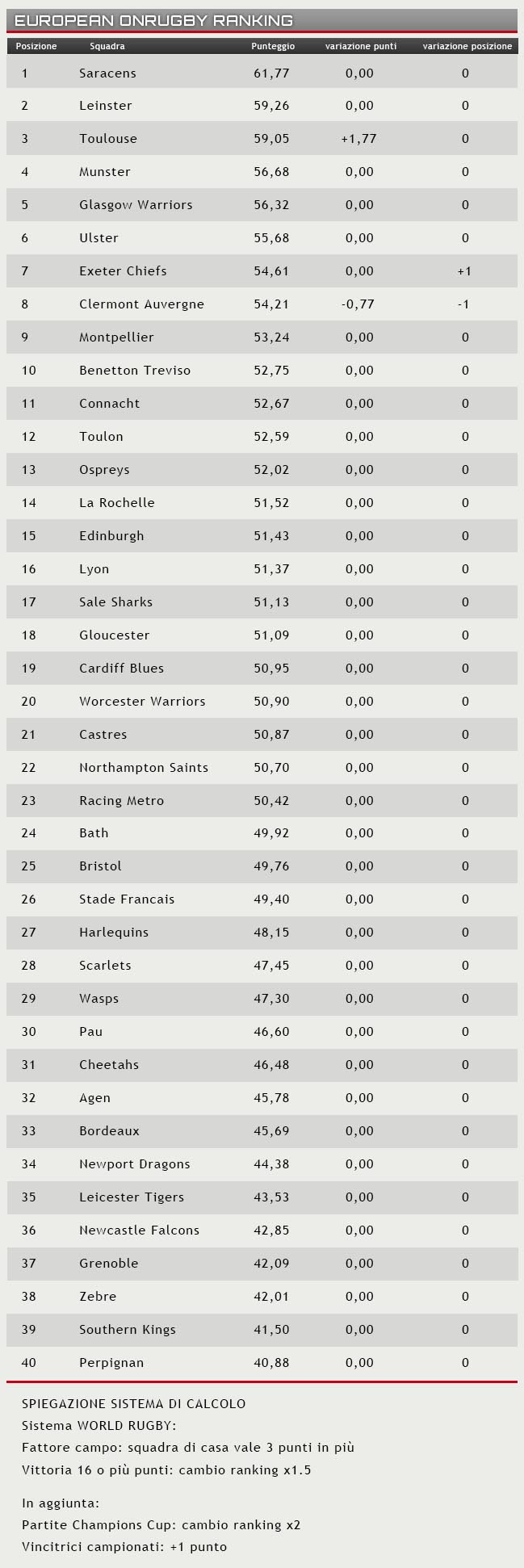 I vincitori della stagione 2018/2019 sono i Saracens che grazie alla doppietta Premiership e Champions Cup hanno relegato al secondo posto il Leinster, vincitore del Ranking dello scorso anno. In terza piazza invece i neo campioni di Francia che con l’affermazione di sabato scorso non hanno fatto altro che consolidare il piazzamento già acquisito nelle settimane precedenti.