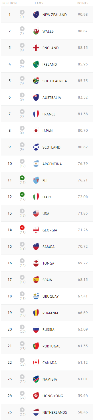 Dopo il terzo weekend della Rugby World Cup 2019 e le partite infrasettimanali, il ranking mondiale si è aggiornato con un solo grande cambiamento nella Top 20, ma piuttosto significativo per la seconda metà che interessa l’Italia. La nazionale azzurra è infatti passata dal 14esimo al 12esimo posto a causa della pesante sconfitta subita dalla Georgia contro le Fiji, che ha fatto scivolare i Lelos a loro volta al 14esimo posto, dietro agli Stati Uniti.