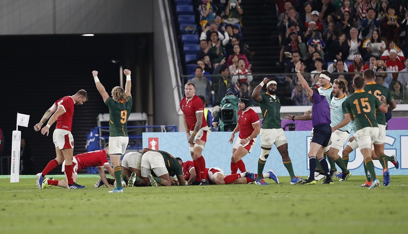 Il Galles si installa sulla linea dei 5 metri sudafricana per 3 minuti e continua ad andare in percussione su una compattissima difesa in verde. I gallesi si guadagnano una punizione piazzabilissima a 5 metri dalla meta ma chiedono mischia, il pubblico all’International Stadium di Yokoama impazzisce. Scelta che viene ripagata, il Galles va in meta con Josh Adams in prima fase, complice una terza linea sudafricana troppo lenta a staccarsi dalla mischia. Halfpenny non sbaglia al piede ed al 64′ la situazione e di nuovo di parità.