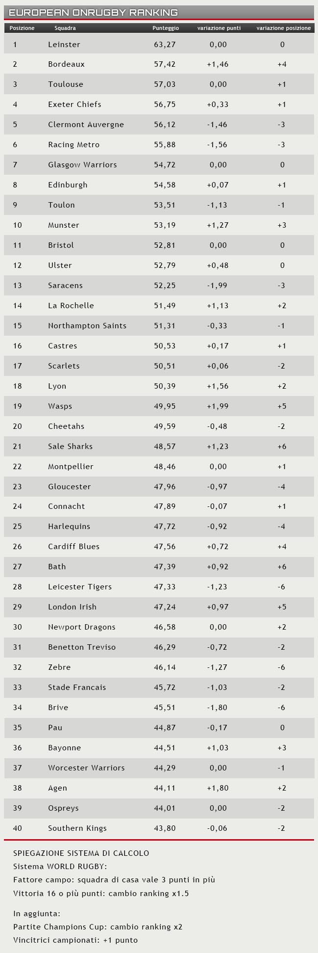Grazie alla vittoria su Clermont (sceso al quinto posto), Bordeaux ha scalato ben quattro posizioni, irrompendo sul podio, subito alle spalle dell’inscalfibile Leinster, saldamente al comando delle operazioni. Terza piazza, invece, occupata da Tolosa, che ha respinto l’assalto di Exeter, vittorioso contro Northampton, ed ora quarto. Rispetto all’ultimo aggiornamento, le italiane perdono posizioni, con il Benetton Rugby che, contestualmente, torna davanti alle Zebre. I Leoni (31esimi) scendono di due piazze, le Zebre (32esime) di ben sei, pagando a caro prezzo la sconfitta interna contro Munster.