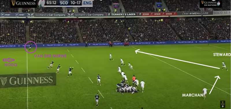 Van der Merwe riceve in velocità e fa quello che sa fare meglio. Siede Malins, impegna Steward e Daly nel placcaggio. Improvvisamente, tutta la linea dei trequarti dell’Inghilterra si trova all’interno dei quindici metri laterali: stoppando il video incorporato sopra a 9:51, vedrete come Ford sia in asse alla ruck, Young è schierato da prima guardia e Slade da primo uomo in piedi. Come illustrato nell’immagine, Marchant è dietro la linea difensiva, a coprire un eventuale calcio, ma nella parte centrale del campo.