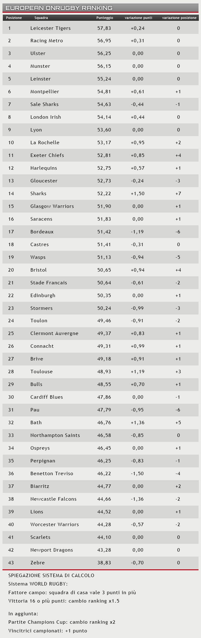 Per finire le ultime tre posizioni, dalla 41 alla 43, occupate rispettivamente da Scarlets, Dragons e Zebre.