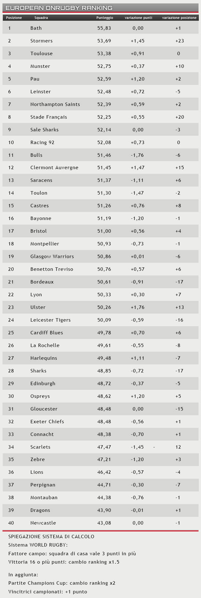 - Per le partite di Champions Cup (e NON di Challenge Cup), lo scambio di punti tra le due squadre viene raddoppiato (massimo 4 punti di scambio per vittoria semplice, 6 punti per ampia vittoria)