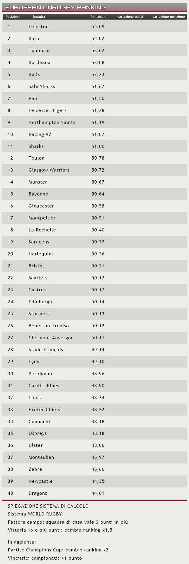 Ricomincia la stagione dei club, e come da tradizione ritorna anche l’European OnRugby Ranking, la classifica europea per club proposta dall’ingegner Luca Corolli, dal 2012 presenza fissa su OnRugby con il suo ranking.