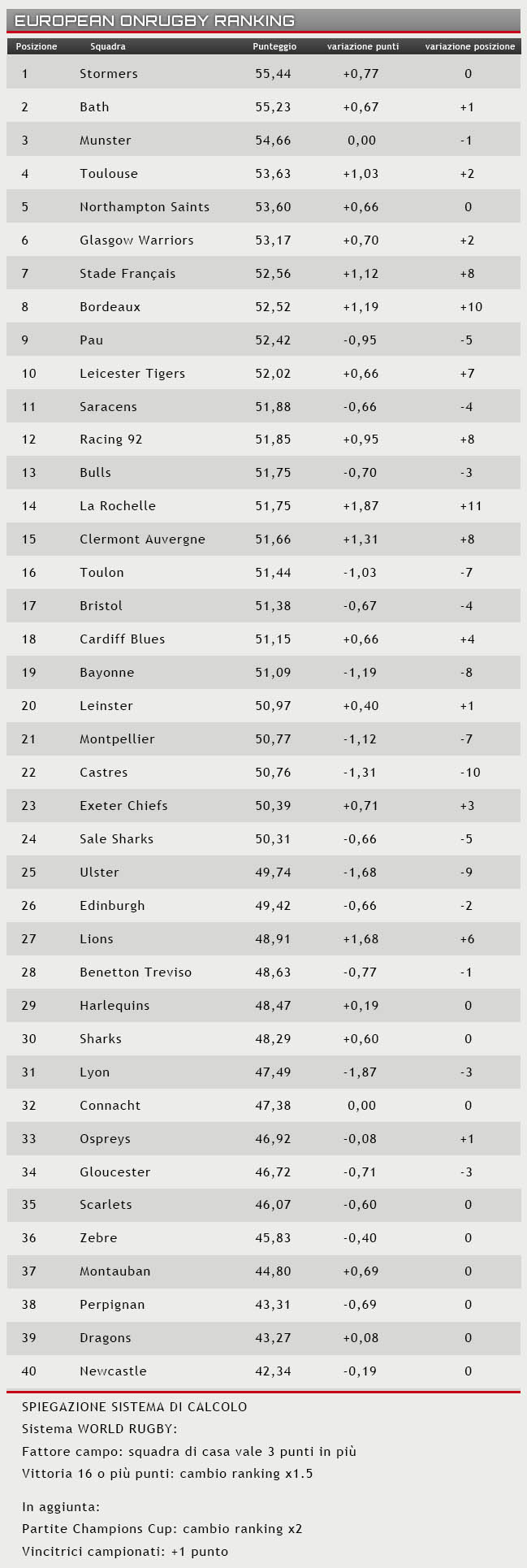 Bel balzo in avanti anche dell’Union Bordeaux-Beglés (+1,19) che scala dieci posizioni e sale all’ottavo posto; segue un’altra squadra francese, il Pau, mentre i Leicester Tigers (+0,77) chiudono la Top 10 guadagnando sette posizioni.