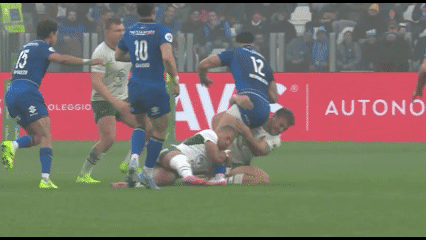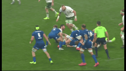 Invece arriva un calcio libero per gli avversari perché, a detta dell’arbitro, Marco Riccioni si toglie dalla spinta degli avversari sull’ingaggio. La situazione si trasforma in un momento difficile per gli Azzurri, che si trovano a difendere nei propri 5 metri e si fanno cogliere mal posizionati su una carica di Marco van Staden.