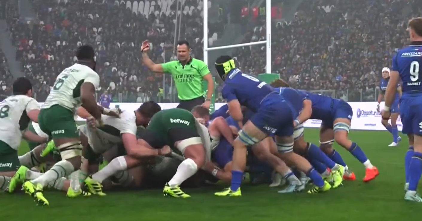 La mischia crolla dal lato di Riccioni. Per l’arbitro Doleman il colpevole è il pilone azzurro, che sarebbe arretrato per far allungare l’avversario e fargli perdere forza