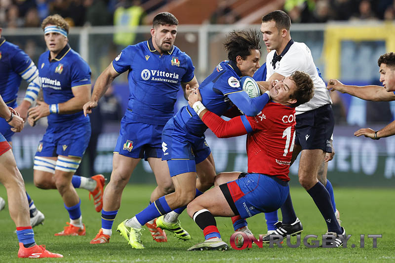La partita è stata comunque dominata in termini di possesso e territorio dalla squadra italiana. A inizio primo tempo, dopo 10′ di pressione, l’Italia trova la prima azione buona con Capuozzo: l’estremo si infila tra i primi due difensori vicino alla ruck, servito da Garbisi per il 7-0.