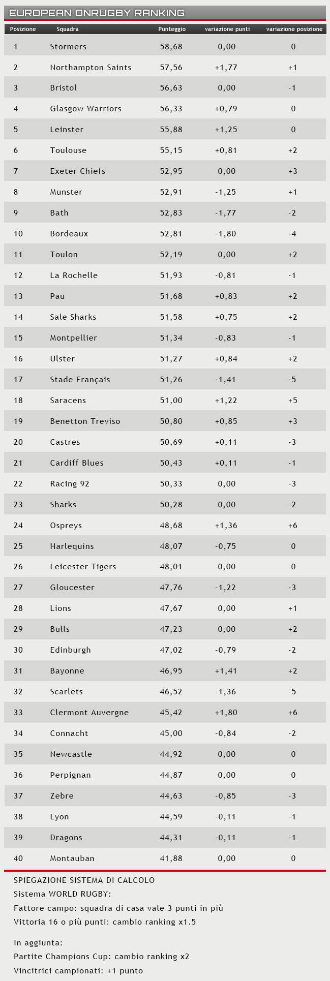 Nella Top5 i Glasgow Warriors e il Leinster, entrambi vittoriosi nei derby di URC con Edinburgh e Munster. La prima della squadre francesi è il Tolosa, detentore del Top14, (sesto posto) che guadagna due posizioni rispetto a una settimana fa. Seguono gli Exeter Chiefs, il Munster, Bath e l’Union Bordeaux-Beglés che chiude la Top10.