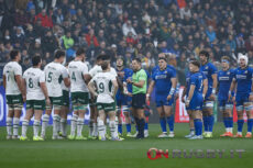 L’arbitro solleva il piede e lo tocca con la mano.