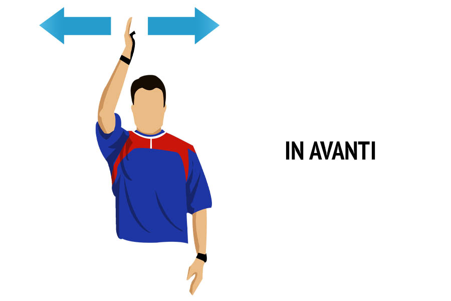 Il braccio dell’arbitro, proteso verso l’alto, si muove da destra verso sinistra e viceversa mimando il pallone che è caduto in avanti.