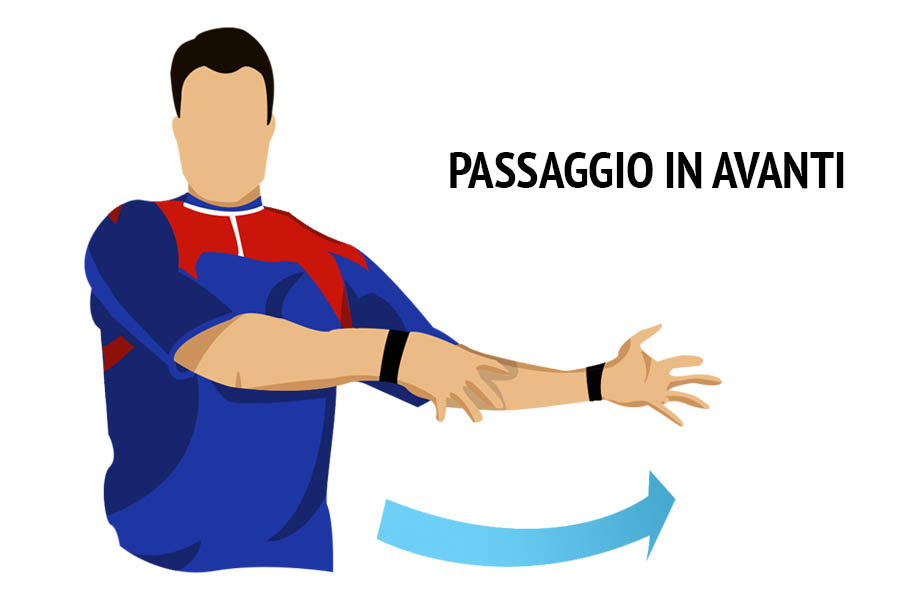 Le mani dell’arbitro imitano il gesto di un passaggio in avanti.