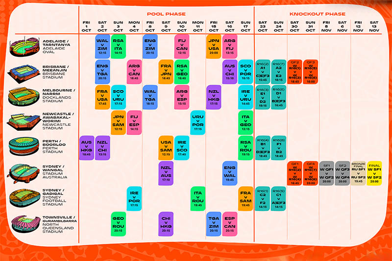 La Rugby World Cup 2027 non è poi così lontana. Il Comitato Organizzatore del torneo ha infatti reso pubblica la versione definitiva del calendario degli orari e degli incontri della prossima kermesse iridata, che scatterà il 1° ottobre e si concluderà il 13 novembre. Da Perth a Melbourne attraversando diverse città e stadi.