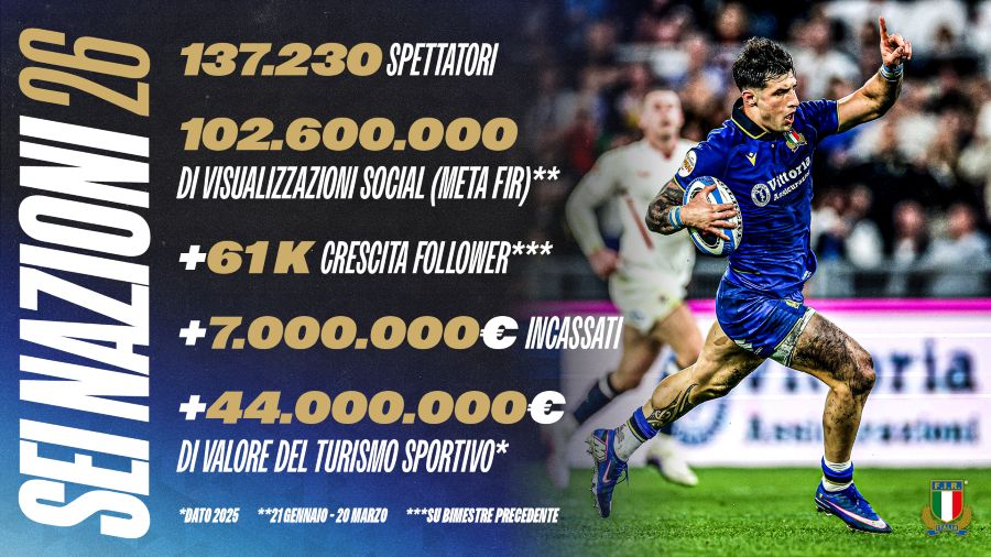 In attesa della Valutazione d’Impatto del Sei Nazioni 2026 – le misurazioni del 2024 e del 2025 sono disponibili cliccando qui – i primi dati di questa edizione confermano il successo dell’evento, con un incasso generale dalla sola biglietteria superiore ai 7.000.000 €, con una crescita percentuale del +51% rispetto all’edizione 2024 (l’ultima con due partite in casa sulle cinque del torneo). E questo senza contare l’importante crescita delle visualizzazioni e delle interazioni sui canali social della federazione.