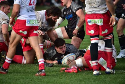 La formazione cremisi parte forte e gestisce il match, ma i biancoblù rispondono con quattro mete e tanti giovani in campo
