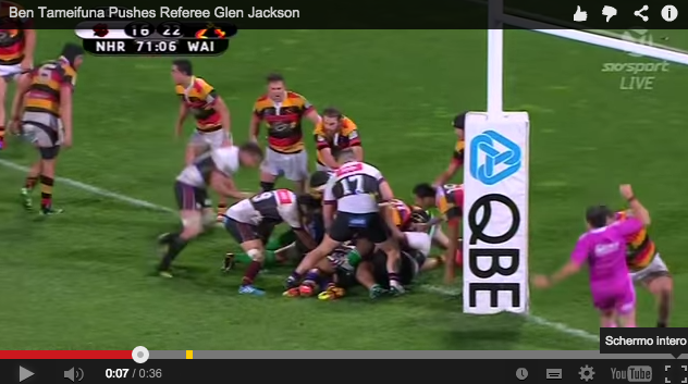 Il pilone di Waikato a pochi minuti dalla fine di una gara di ITM Cup spinge via in malo modo l'arbitro...