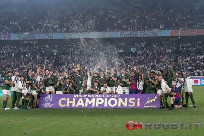 I calci di Pollard e Farrell e le mete di Mapimpi e Kolbe. E poi il momento in cui gli Springboks possono sollevare la coppa