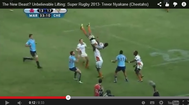 L’avevamo già vista con protagonista Mtawarira, questa volta è Nyakane dei Cheetahs. Calcio d’inizio, un singolo pilone solleva il ricevitore che si sbilancia. Il resto lo fanno i muscoli…